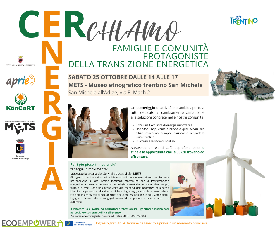 A queste domande proverà a rispondere “CERchiamo energia – Famiglie e comunità protagoniste della transizione energetica”, l’evento organizzato dall’Agenzia provinciale per le risorse idriche e l’energia (APRIE) della Provincia autonoma di Trento, in collaborazione con la Comunità energetica KönCeRT società cooperativa impresa sociale e il METS – Museo etnografico trentino San Michele.