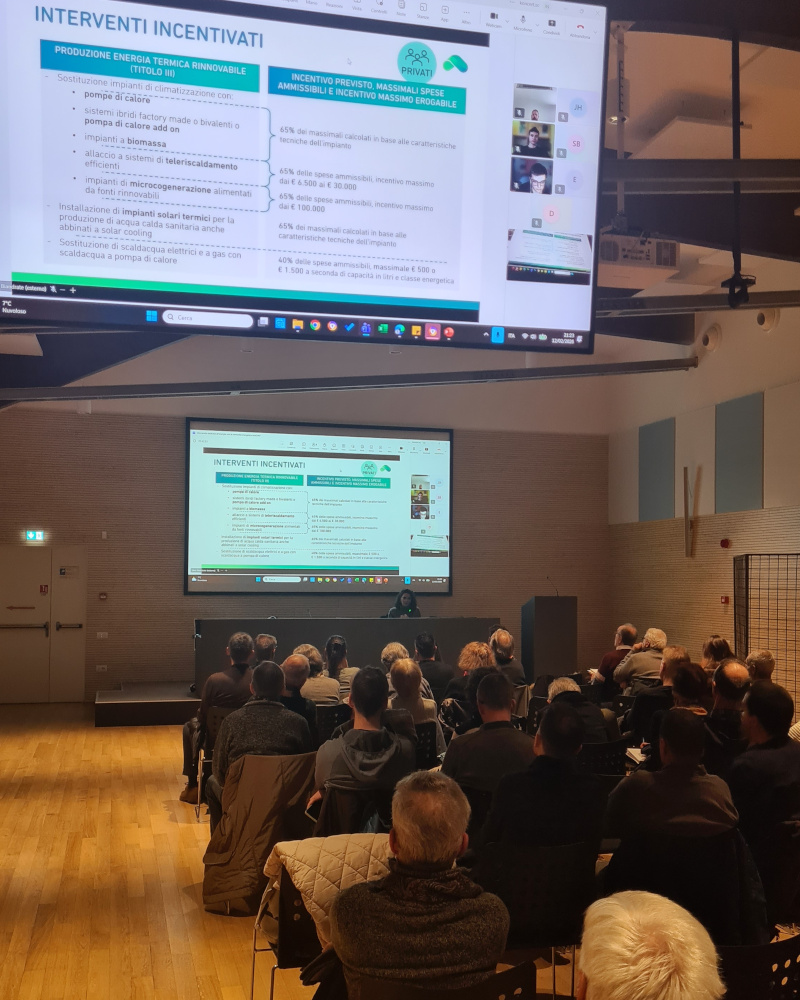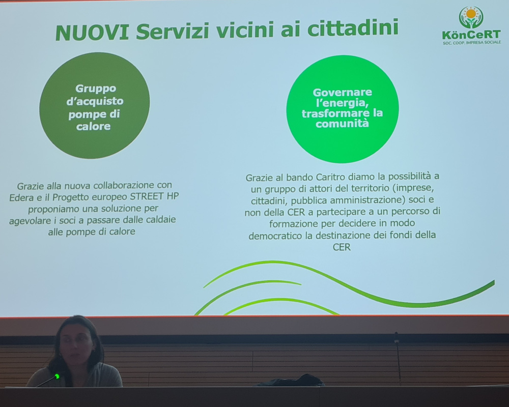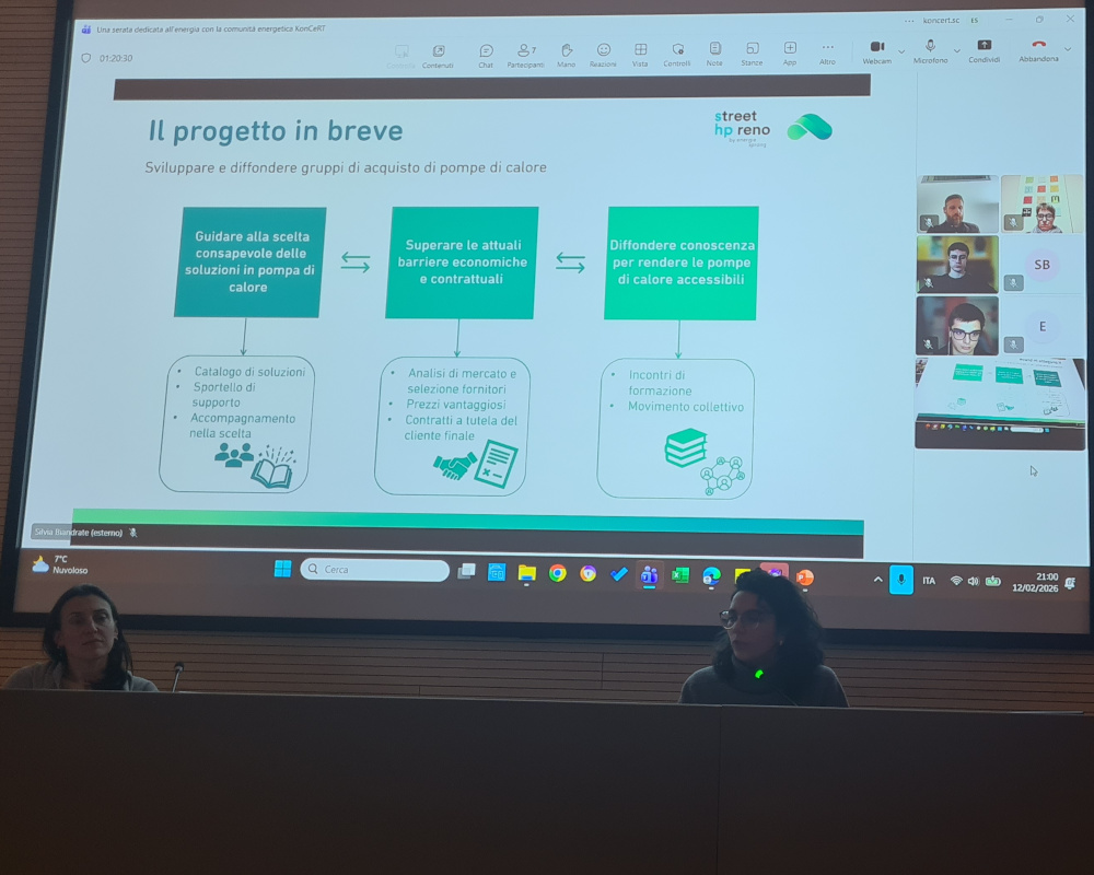 Efficientamento e pompe di calore: l’opportunità dei Gruppi d’Acquisto L’intervento dell’ing. Silvia Biandrate (Edera Impresa Sociale) ha toccato un tema caldissimo: le pompe di calore. Nonostante l’elevata efficienza (3,5 contro lo 0,9 delle caldaie a gas), il costo resta un ostacolo. Una soluzione possibile? Il progetto europeo LIFE HP Street Reno, che vede in KönCeRT il tramite per attivare su un territorio pilota dei gruppi d’acquisto collettivi. Grazie alla massa critica dei soci, potremo accedere a prezzi agevolati e verranno fornite consulenze specializzate per il dimensionamento degli impianti e l’accesso al Conto Termico 3.0.
